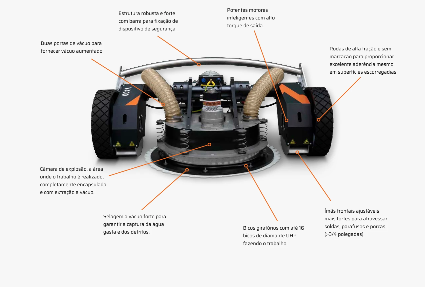 Sim, como usamos ímãs permanentes para manter os robôs presos à superfície, o uso de abrasivos magnéticos como granalhas de aço não será possível. Qualquer outra (não magnética) é adequada.